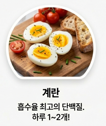 - 계란: 흡수율이 가장 좋은 단백질원입니다. 하루 1~2개 추천!