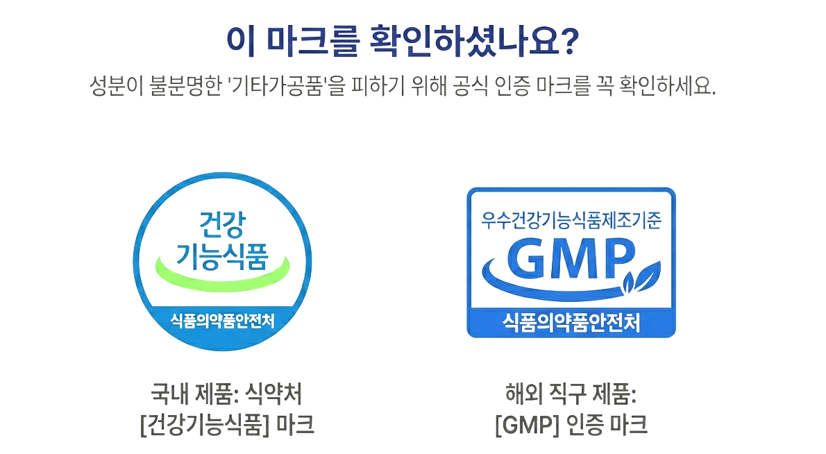 직구 제품 중에는 성분 함량이 불분명한 '기타가공품'도 많아요. 국내 제품을 산다면 식약처의 [건강기능식품] 마크가 있는지, 직구라면 GMP 인증 마크가 있는지 꼭 확인하세요.