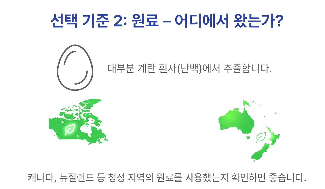 | 2. 원료 출처 | 계란 흰자(난백) vs 합성 | 캐나다, 뉴질랜드 등 청정 지역 원료 선호 |