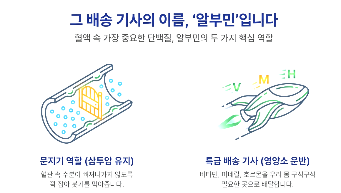 이뿐만이 아니에요! 알부민은 비타민, 미네랄, 호르몬 같은 각종 영양소를 등에 업고 우리 몸 구석구석 필요한 곳으로 배달해 주는 '특급 배송 기사' 역할도 해요. 그러니 알부민이 부족하면 영양소가 제대로 전달되지 않고, 몸이 붓고, 기력이 떨어지는 게 당연하겠죠?