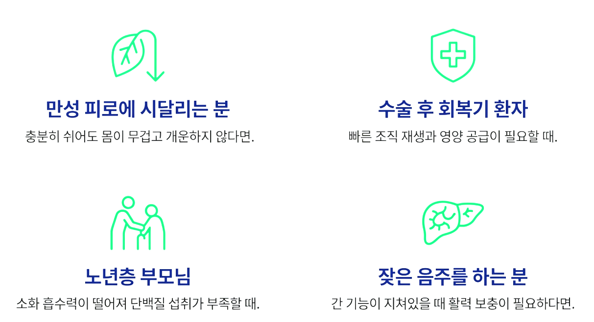 - 만성 피로에 시달리는 분: 충분히 쉬어도 몸이 무겁다면 단백질 대사 저하를 의심해볼 수 있어요.