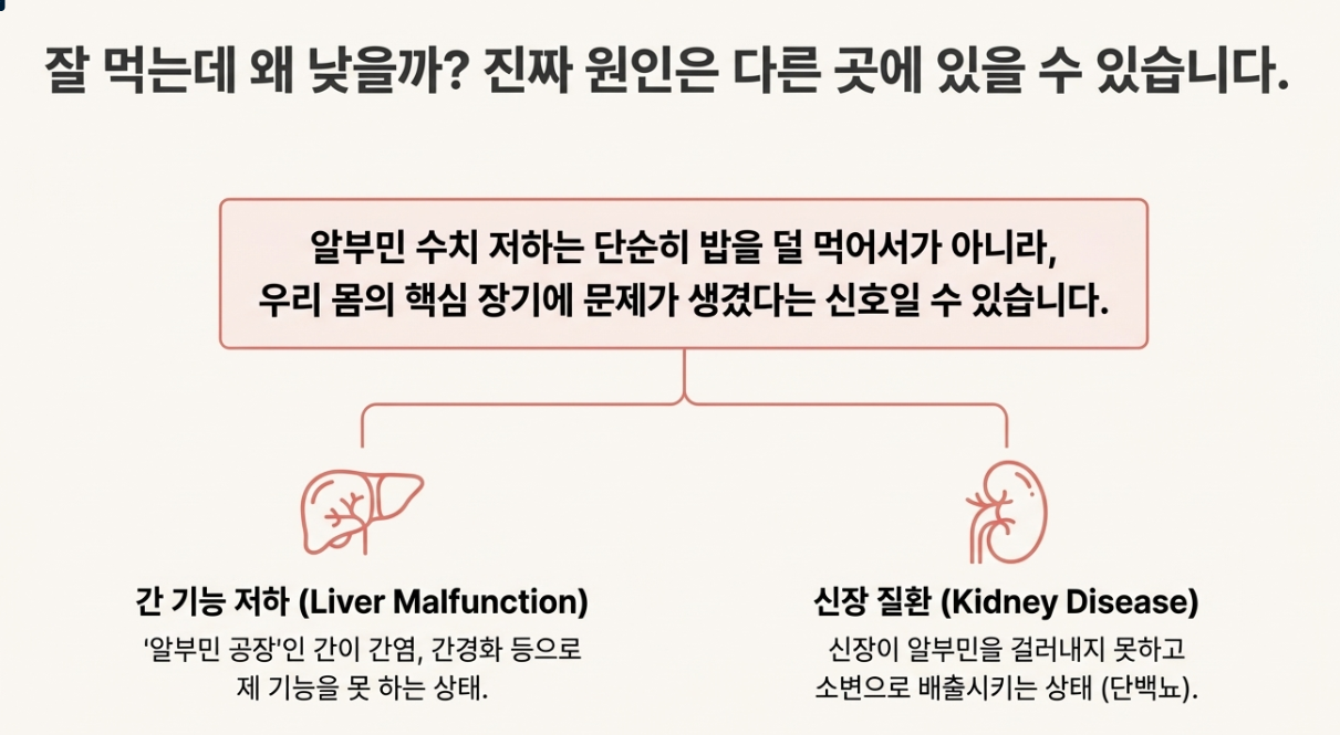 - 신장(콩팥) 질환: 신증후군 같은 병이 있으면, 신장이 알부민을 걸러내지 못하고 소변으로 줄줄 새어 나가게 만들어요. (단백뇨)
