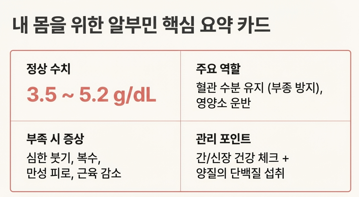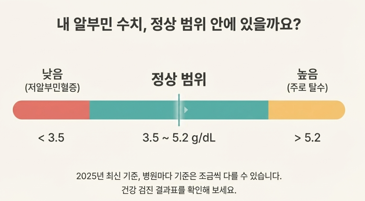 | 낮음 (저알부민혈증) | 3.5 미만 | 영양부족, 간/신장 질환 의심 |