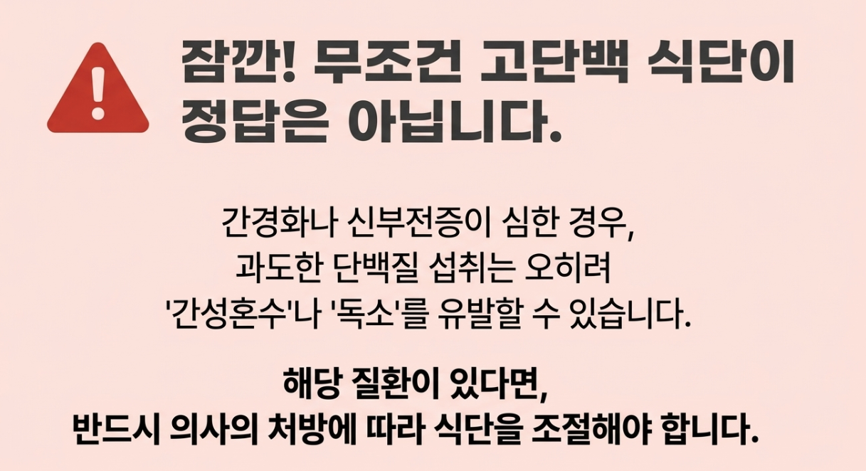 하지만, 만약 간경화나 신부전증이 심한 분들은 단백질을 너무 많이 먹으면 오히려 간성혼수나 독소가 쌓일 수 있어서 위험해요. 이런 분들은 반드시 의사 선생님 처방에 따라 식단을 조절하셔야 해요. 무조건 고단백이 정답은 아니랍니다! 🙅♀️