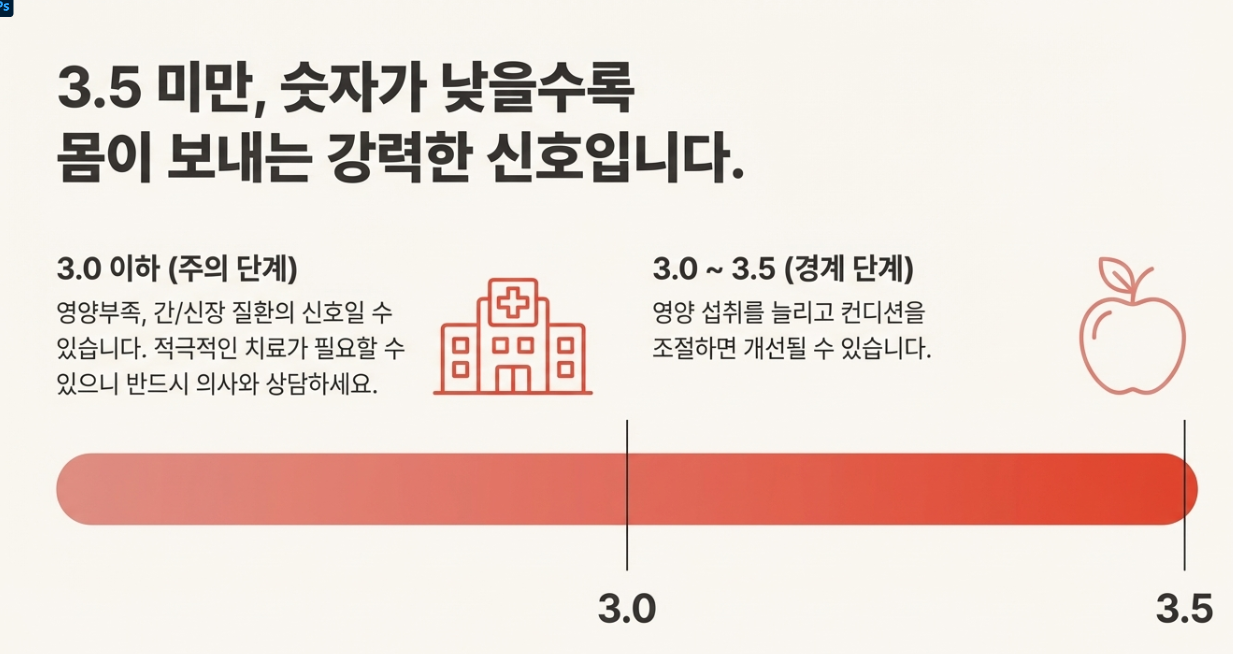 수치가 3.0~3.5 사이라면 '경계' 단계로, 영양 섭취를 늘리고 컨디션을 조절하면 좋아질 수 있어요. 하지만 3.0 이하라면 적극적인 치료가 필요한 상태일 수 있으니 꼭 의사 선생님과 상담하셔야 해요.