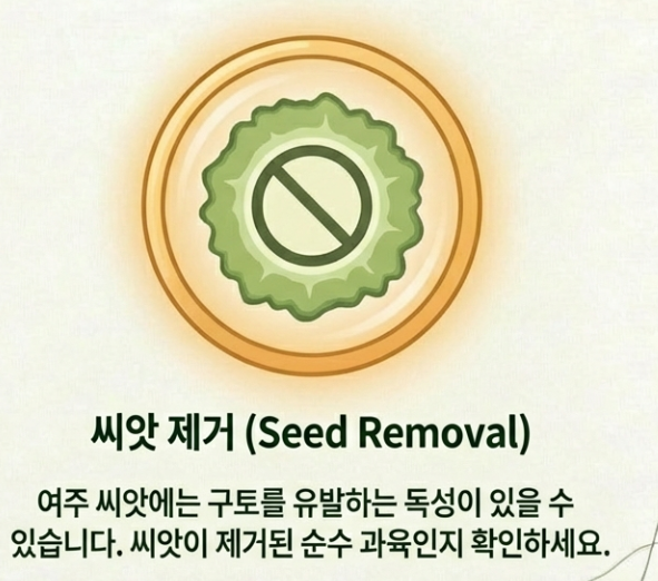 껍질째 우려 마시는 차니까 농약 걱정 없는 국내산 유기농 제품을 고르는 게 마음 편하겠죠? 원산지 확인은 필수입니다! - 3. 씨앗 제거 여부 🧐