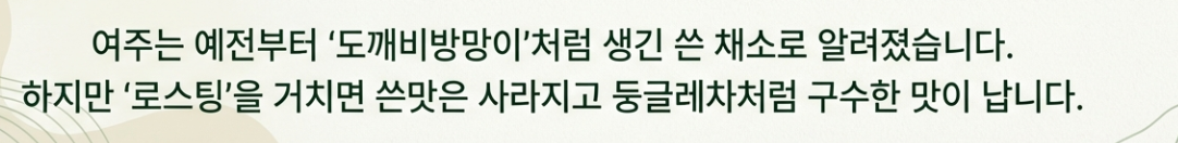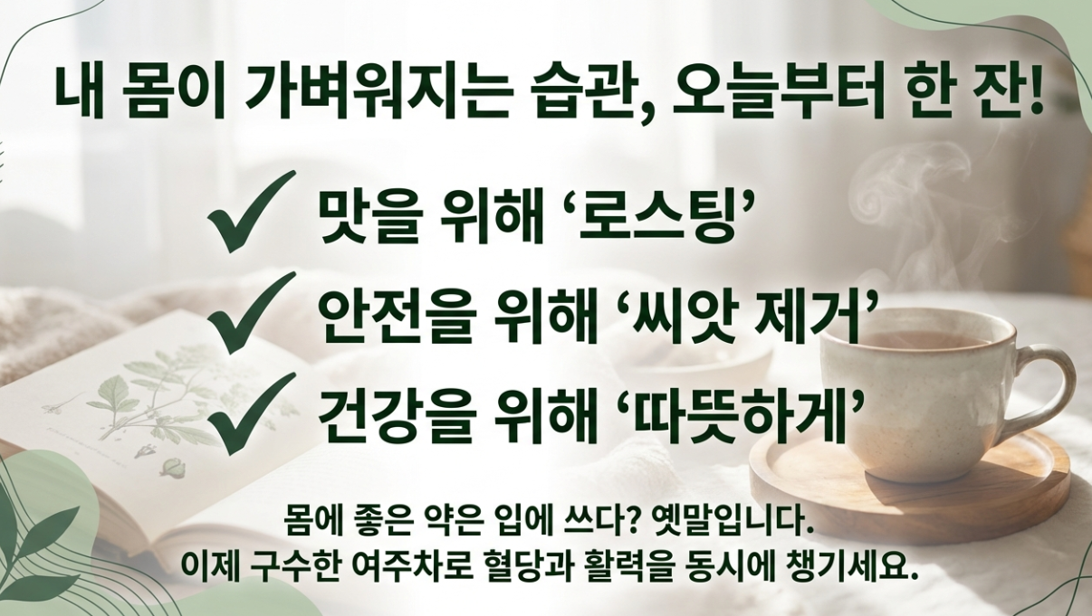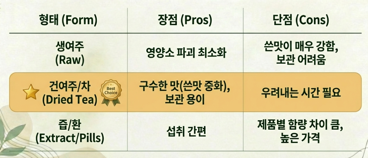 | 건여주(차) | 구수한 맛(쓴맛 중화), 보관 용이 | 우려내는 시간 필요 |