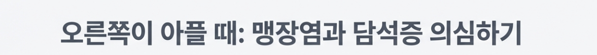 - 담낭염/담석증: 오른쪽 갈비뼈 바로 아래가 아프고, 심하면 오른쪽 어깨까지 통증이 퍼질 수 있습니다. 기름진 음식을 먹고 나서 더 아프다면 의심해보세요.