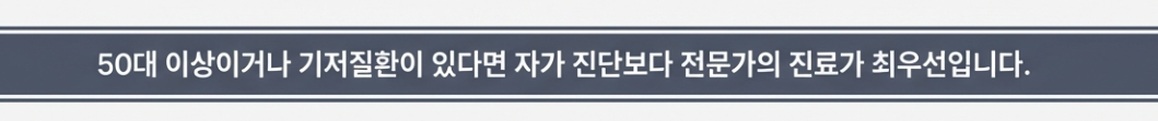 이 체크리스트는 참고용일 뿐입니다. 특히 **50대 이상**이거나 **기저질환**이 있는 분들은 자가 진단보다는 전문가의 진료가 최우선이라는 점, 꼭 기억해주세요!