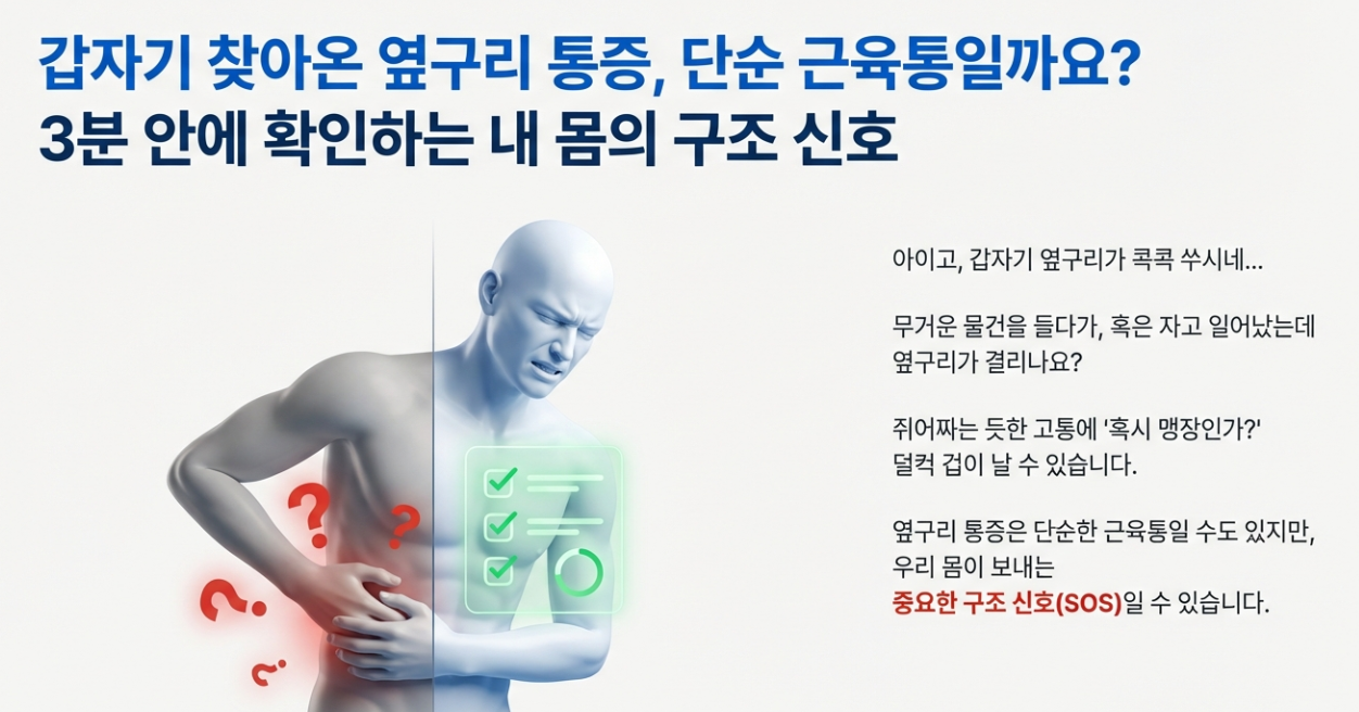 옆구리 통증은 단순히 잠을 잘못 자서 생긴 근육통일 수도 있지만, 우리 몸이 보내는 **중요한 구조 신호(SOS)**일 수도 있습니다. 특히 통증의 위치가 왼쪽이냐 오른쪽이냐에 따라 원인이 천차만별인데요. 오늘은 제가 2026년 최신 의료 가이드라인을 바탕으로 정리한 내용을 통해, 여러분의 통증이 병원에 가야 할 신호인지 속 시원하게 알려드릴게요! 😊