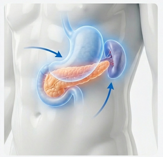 왼쪽에는 비장, 위장, 췌장의 일부가 있습니다.