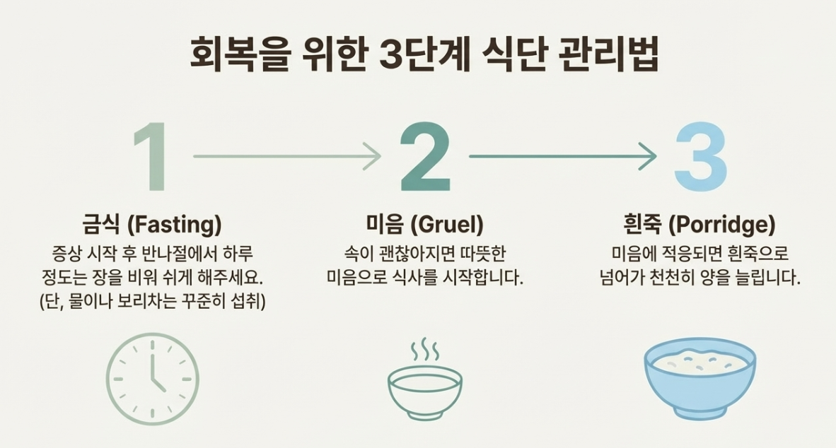저는 하루 정도는 아예 굶어서 장을 비우고, 따뜻한 보리차만 마셨더니 훨씬 속이 편해지더라고요. 배고프다고 바로 밥을 먹기보단 미음부터 천천히 시작하는 게 중요해요!