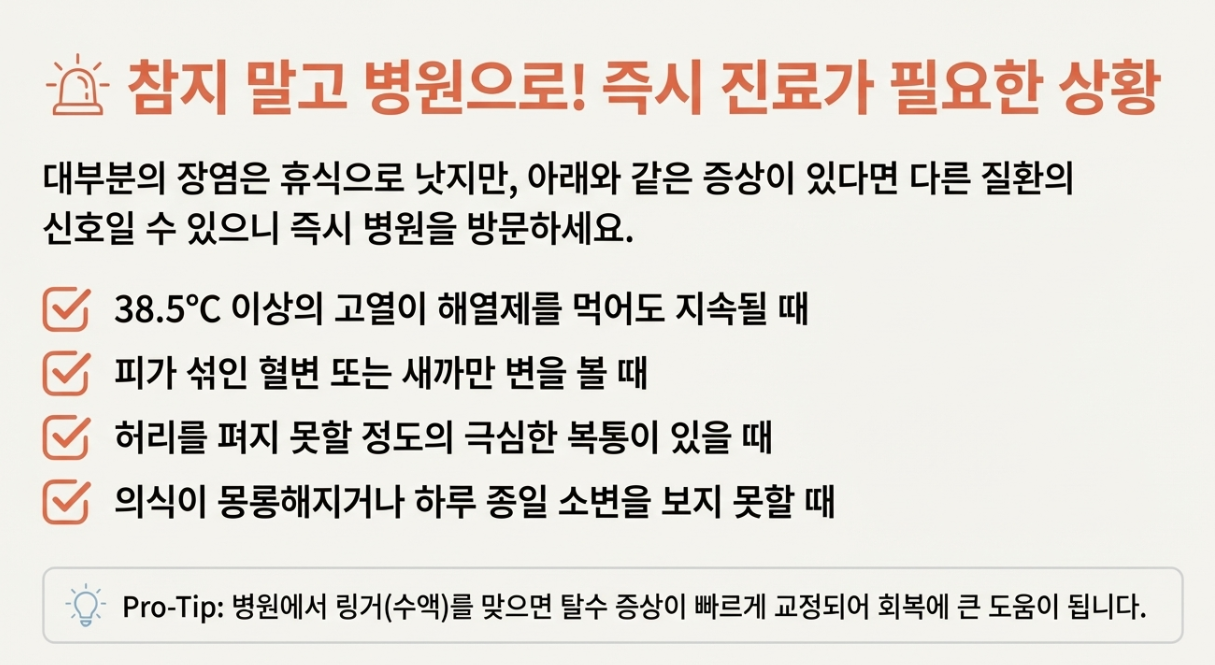 대부분의 장염은 며칠 쉬면 낫지만, 절대 참으면 안 되는 순간들이 있어요. 구체적인 상황을 예로 들어 설명해 드릴게요.