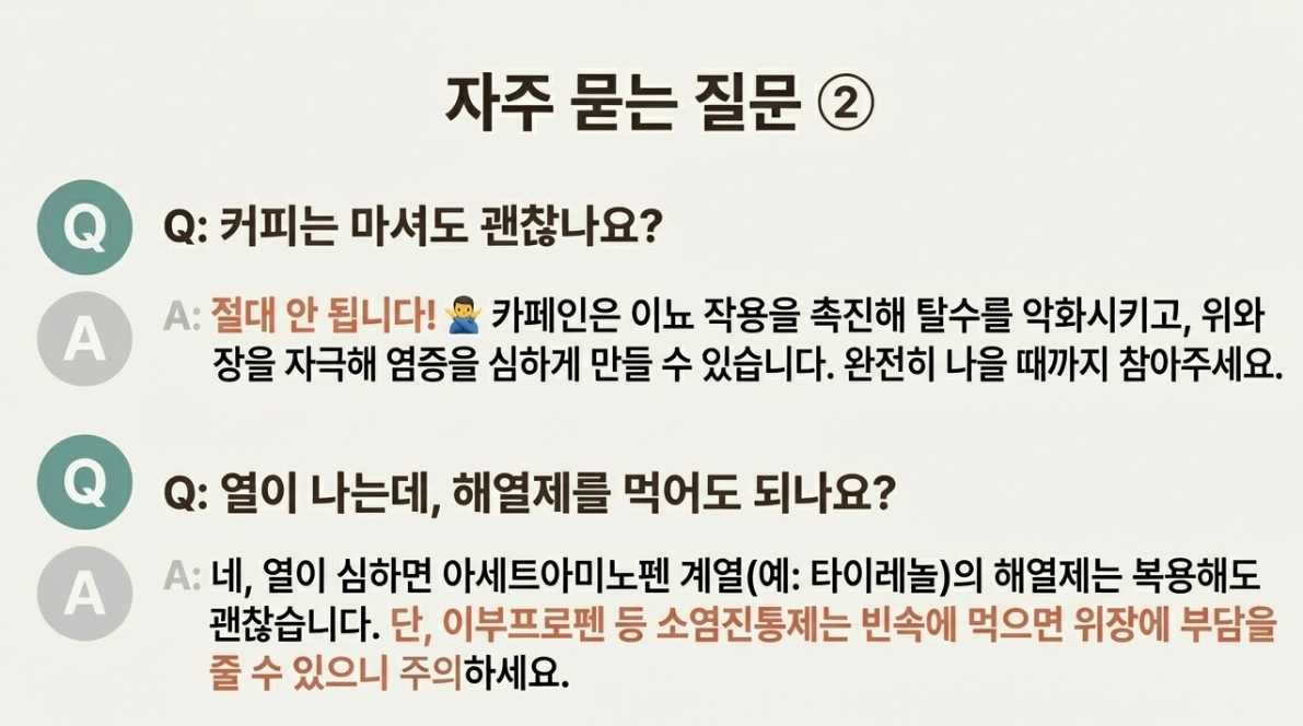 - 식단 관리: 하루 정도 금식하거나 흰죽, 이온음료 위주로 드세요. (우유, 커피 금지!)