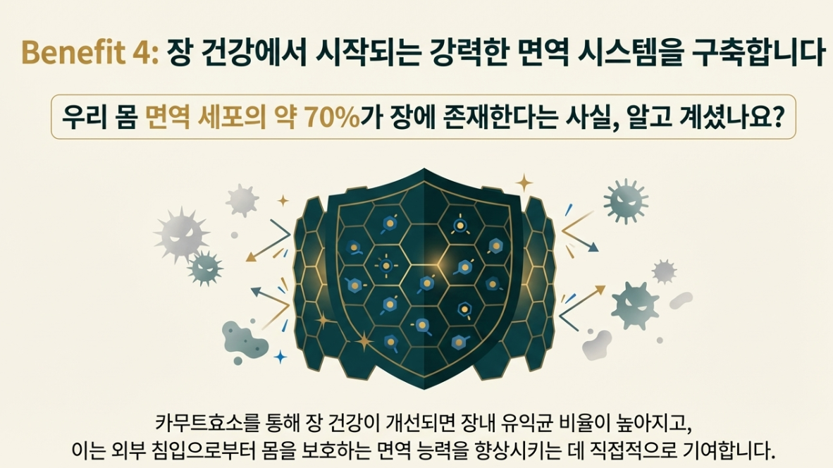 우리 몸의 면역 세포 약 70%가 장에 존재한다는 사실, 알고 계셨나요? 카무트효소를 통해 장 건강이 개선되면 자연스럽게 면역력 강화에도 긍정적인 영향을 미칩니다. 장내 유익균 비율이 높아지고 유해균이 줄어들면, 외부 침입으로부터 몸을 보호하는 능력이 향상될 수 있어요.