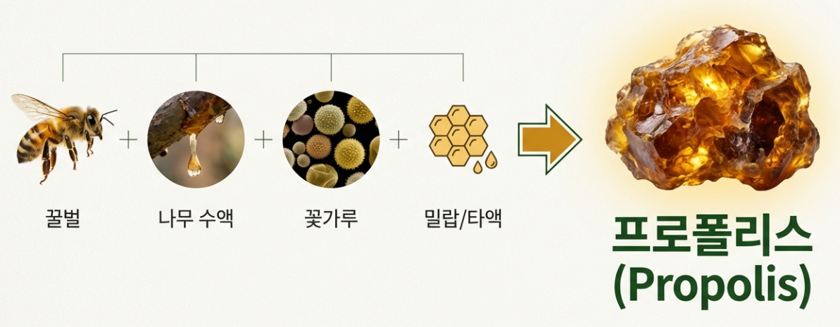 프로폴리스(Propolis)는 꿀벌이 자신의 집을 세균과 바이러스로부터 보호하기 위해 나무의 수액과 꽃가루, 그리고 자신의 밀랍(타액)을 섞어 만든 끈적한 물질입니다. 벌통 하나에 수만 마리의 벌이 살지만, 내부가 무균 상태로 유지되는 비결이 바로 이 프로폴리스 덕분이죠.