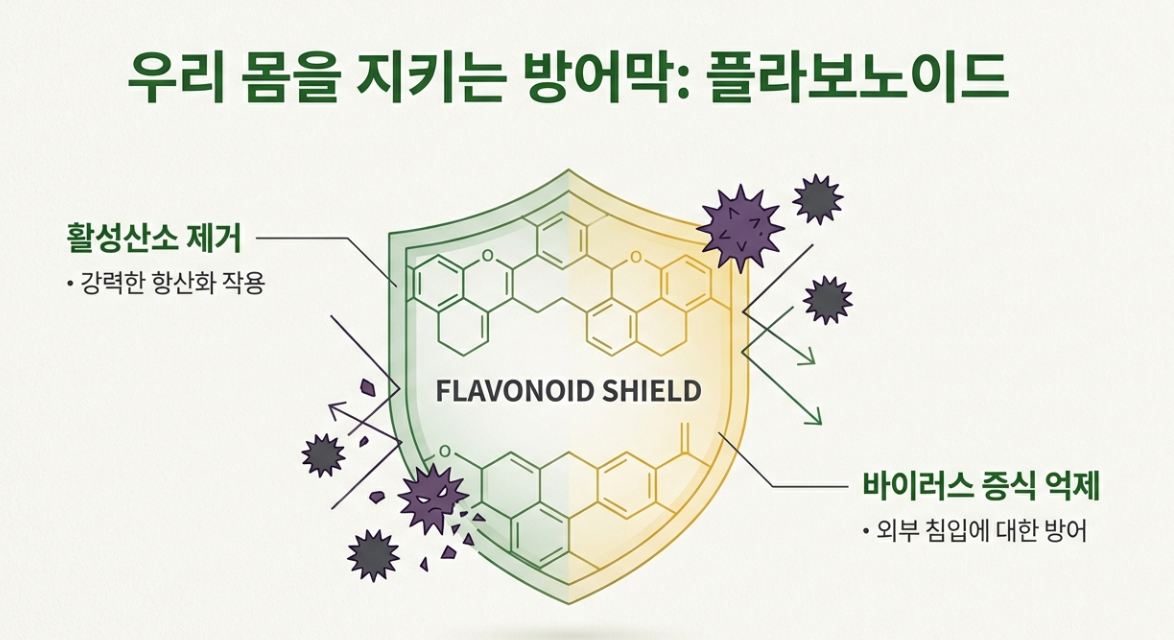 핵심 성분은 바로 플라보노이드(Flavonoid)입니다. 이 성분이 우리 몸속에 들어오면 활성산소를 제거하고, 외부에서 침입한 바이러스 증식을 억제하는 강력한 방어막 역할을 합니다.