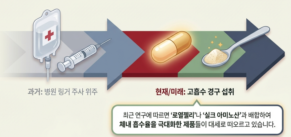 예전에는 주로 주사제로 알부민을 보충했지만, 최근 2026년 연구들에 따르면 고함량 '로열젤리'나 '실크 아미노산'과 배합하여 체내 흡수율을 높인 먹는 알부민 제품들이 대세로 떠오르고 있어요.