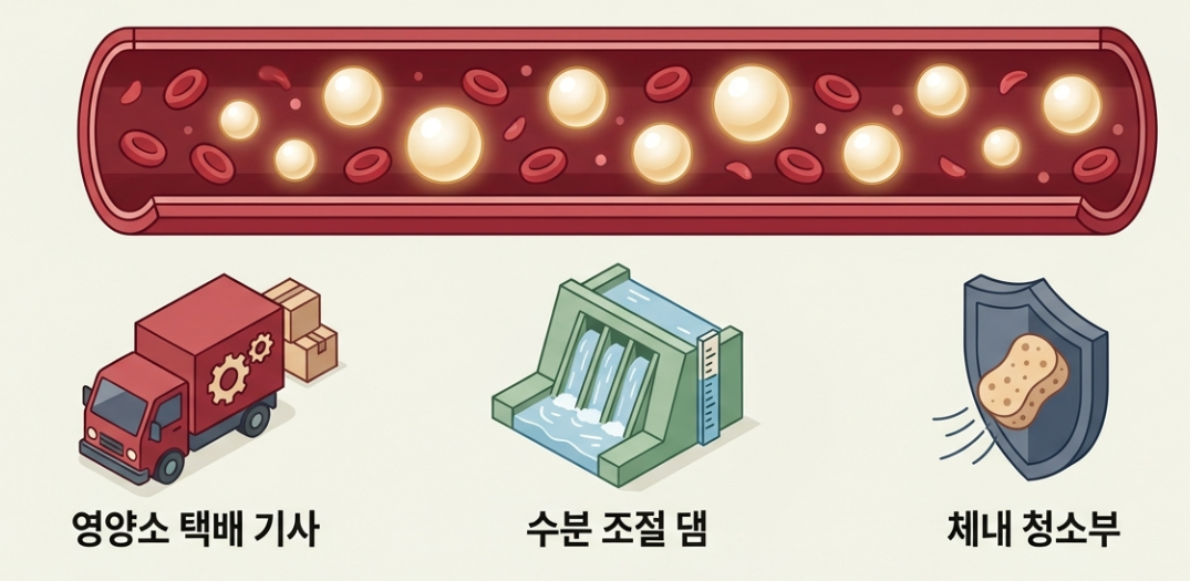 - 🚚 영양소 배달: 비타민, 미네랄, 호르몬 등 우리 몸에 필요한 영양소를 싣고 혈관을 타고 구석구석 배달해 줘요.