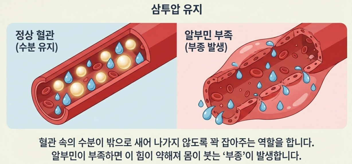 - ⚖️ 수분 조절 (삼투압 유지): 혈관 속의 물이 밖으로 새어 나가지 않도록 꽉 잡아주는 역할을 해요. 알부민이 부족하면 몸이 붓는(부종) 이유가 바로 이 힘이 약해져서랍니다.