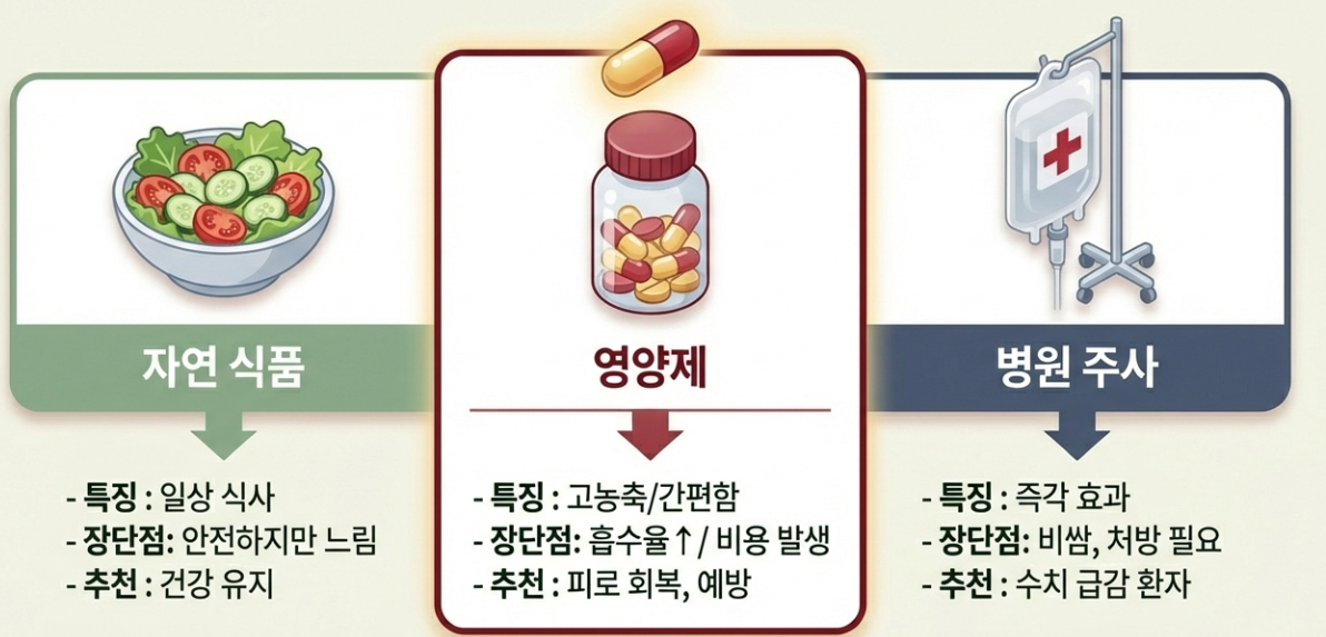 | 구분 | 자연 식품 섭취 | 영양제 (보충제) | 병원 주사 (IV) |