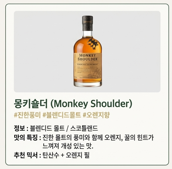- 술의 풍미와 무게감을 즐긴다면? → 몽키숄더 (몰트의 풍미) 또는 조니워커 블랙 (스모키함)