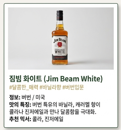 - 달달한 술이 좋다면? → 짐빔 (버번의 단맛) 또는 제임슨 (진저에일과 꿀조합)