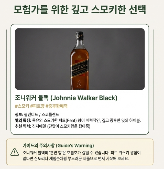 조니워커 블랙의 경우 특유의 '스모키한 향(훈연 향)'이 있어 호불호가 갈릴 수 있습니다. 입문자라면 산토리나 제임슨처럼 부드러운 제품으로 시작하는 것을 추천해요!
