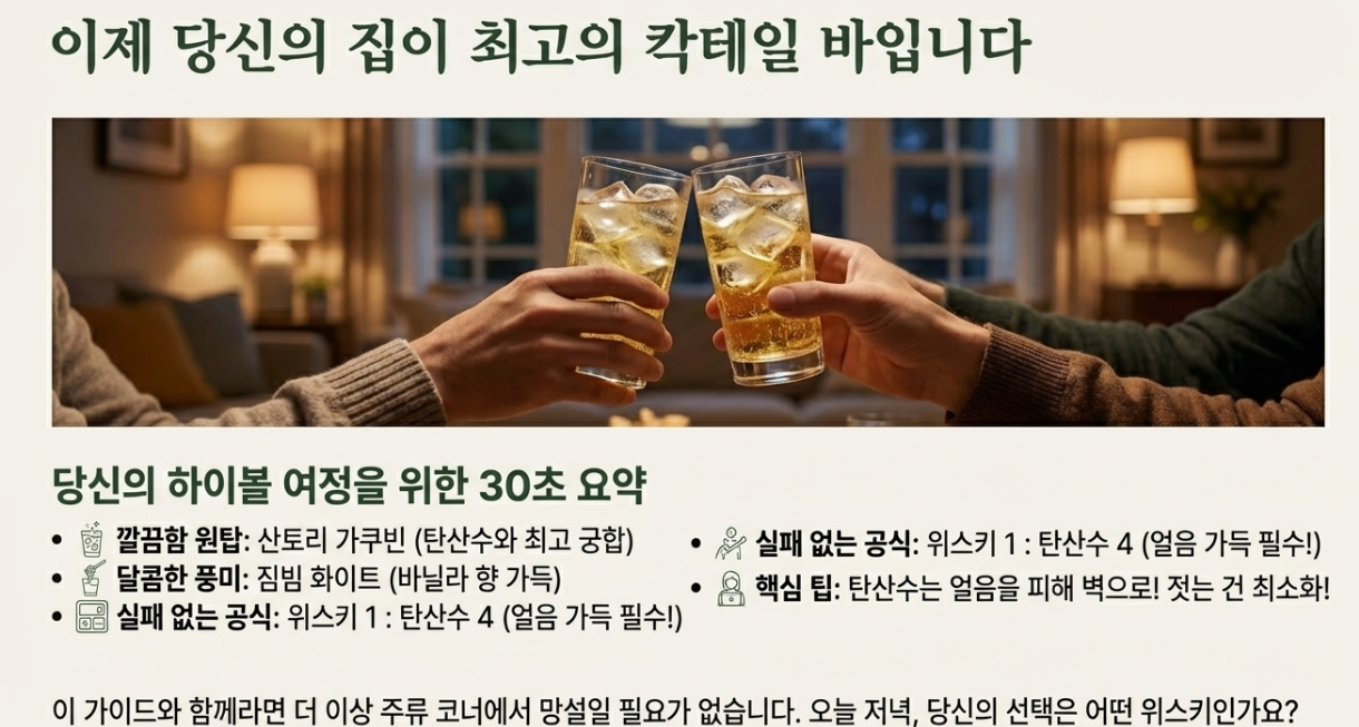 안녕하세요! 요즘 집에서 가볍게 술 한잔 즐기는 '홈술' 문화가 자리 잡으면서, 하이볼의 인기가 정말 식을 줄 모르네요. 저도 퇴근 후 시원하게 말아 마시는 하이볼 한 잔이면 하루의 피로가 싹 풀리는 기분이에요. 그런데 막상 마트 주류 코너에 가면 종류가 너무 많아서 "도대체 뭘 사야 하지?" 고민하신 적 있으시죠? 비싼 싱글몰트를 타 마시자니 아깝고, 너무 저렴한 걸 사자니 맛이 없을까 봐 걱정되기도 하고요.