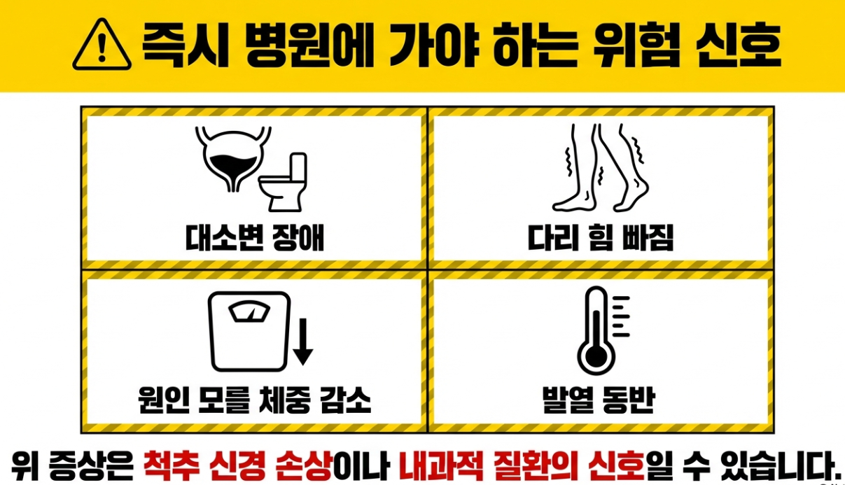 만약 허리 통증과 함께 대소변 장애, 다리 힘 빠짐, 원인 모를 체중 감소, 발열이 동반된다면 즉시 응급 진료를 받아야 합니다. 이는 척추 신경의 심각한 손상이나 다른 내과적 질환의 신호일 수 있어요!