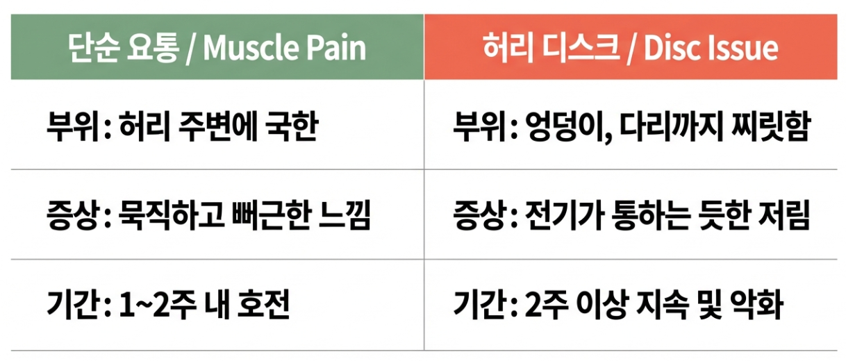 | 구분 | 단순 요통 (근육통) | 허리 디스크 |