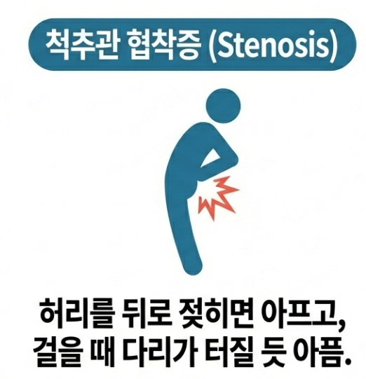 - 척추관 협착증 (중장년 층 多): 신경이 지나가는 통로인 척추관이 좁아져 신경을 압박하는 상태입니다. 허리를 뒤로 젖히면 아프고, 걸을 때 다리가 터질 듯 아픈 게 특징이에요.