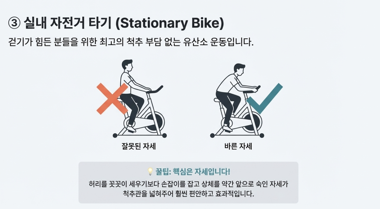 - 유산소: 걷기가 힘들다면 상체를 숙이고 타는 실내 자전거가 최고의 대안입니다.