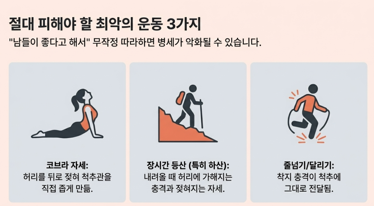 "남들이 좋다고 해서" 무작정 따라 했다가 병세가 악화되는 경우가 정말 많아요. 특히 허리를 과도하게 뒤로 젖히는 동작은 독이 될 수 있습니다.