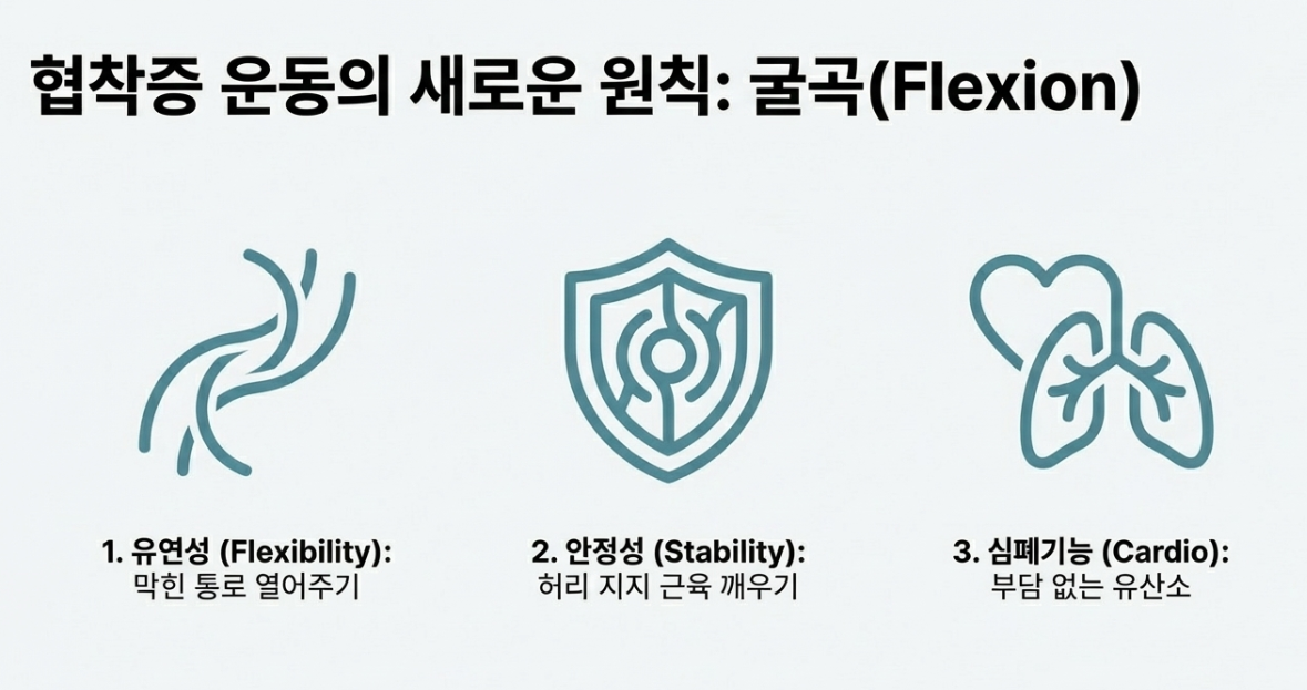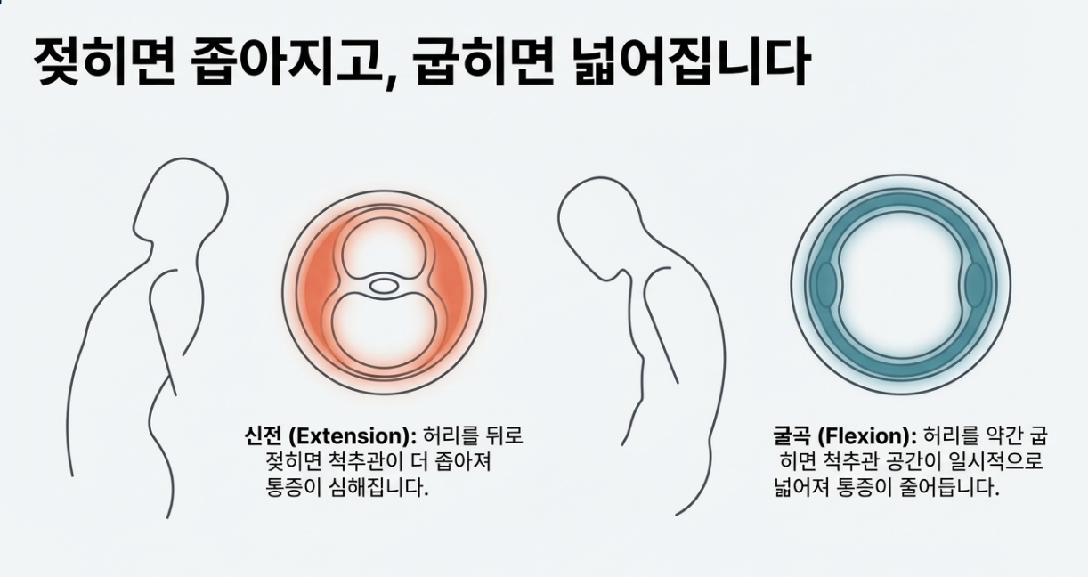 이때 허리를 뒤로 젖히면 척추관이 더 좁아져서 통증이 심해지지만, 허리를 약간 굽히면 척추관 공간이 일시적으로 넓어져서 통증이 줄어들어요. 그래서 협착증 환자분들은 '신전 운동(허리 펴기)'보다는 '굴곡 운동(허리 굽히기)' 위주로 진행해야 한답니다.