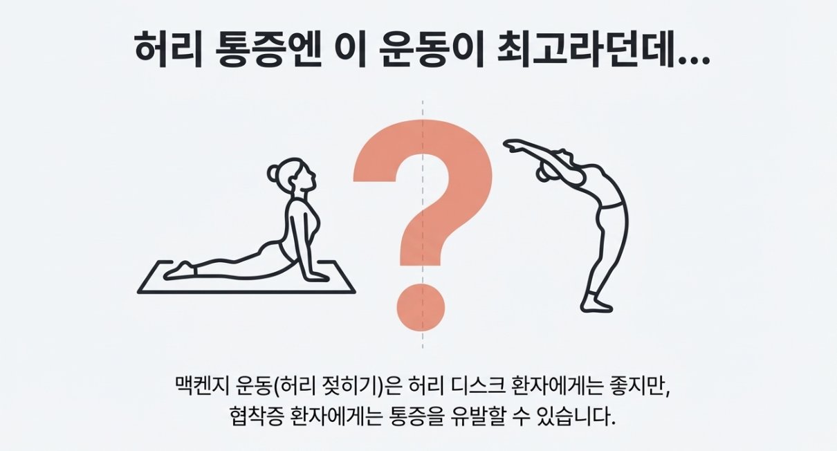 맥켄지 운동(허리 젖히기)은 허리 디스크 환자에게는 좋지만, 협착증 환자에게는 통증을 유발할 수 있으니 주의가 필요합니다. 운동 중 통증이 느껴지면 즉시 중단하세요!
