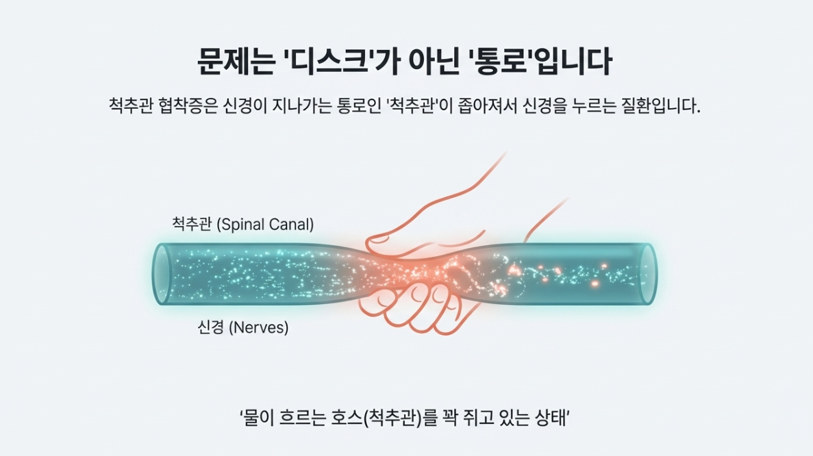 척추관 협착증은 신경이 지나가는 통로인 '척추관'이 좁아져서 신경을 누르는 질환이에요. 쉽게 비유하자면, 물이 흐르는 호스(척추관)를 꽉 쥐고 있는 상태라고 볼 수 있죠.