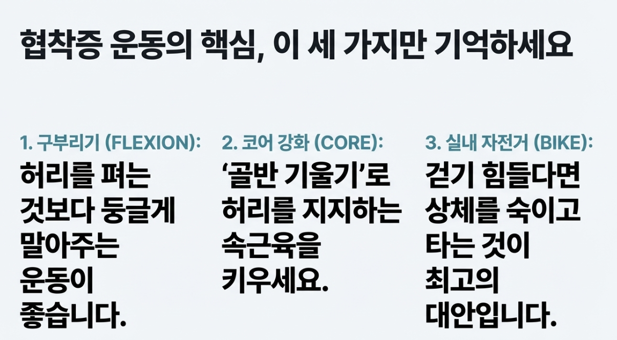- 통증 없는 범위: "아파야 운동이 된다"는 옛말! 협착증은 통증이 없는 범위 내에서 부드럽게 움직이는 것이 핵심입니다.