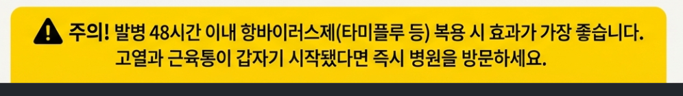 A형 독감은 발병 48시간 이내에 항바이러스제(타미플루 등)를 복용해야 효과가 가장 좋습니다. 고열과 근육통이 갑자기 시작됐다면 바로 병원으로 가세요!