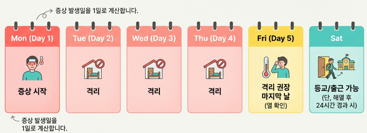 쉽게 예를 들어볼까요? 만약 월요일에 증상이 시작되었다면, 월요일을 1일차로 보고 화(2), 수(3), 목(4), 금(5)요일까지 5일간 격리를 권장합니다. 따라서 열이 없다면 토요일부터는 등교나 출근이 가능할 수 있습니다.