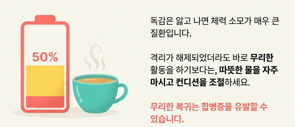 독감은 앓고 나면 체력이 정말 많이 떨어지더라고요. 격리 해제 후에도 무리하지 마시고, 따뜻한 물 많이 드시면서 컨디션 조절 잘 하시길 바랍니다. 우리 모두 건강한 겨울 보내요! 💪